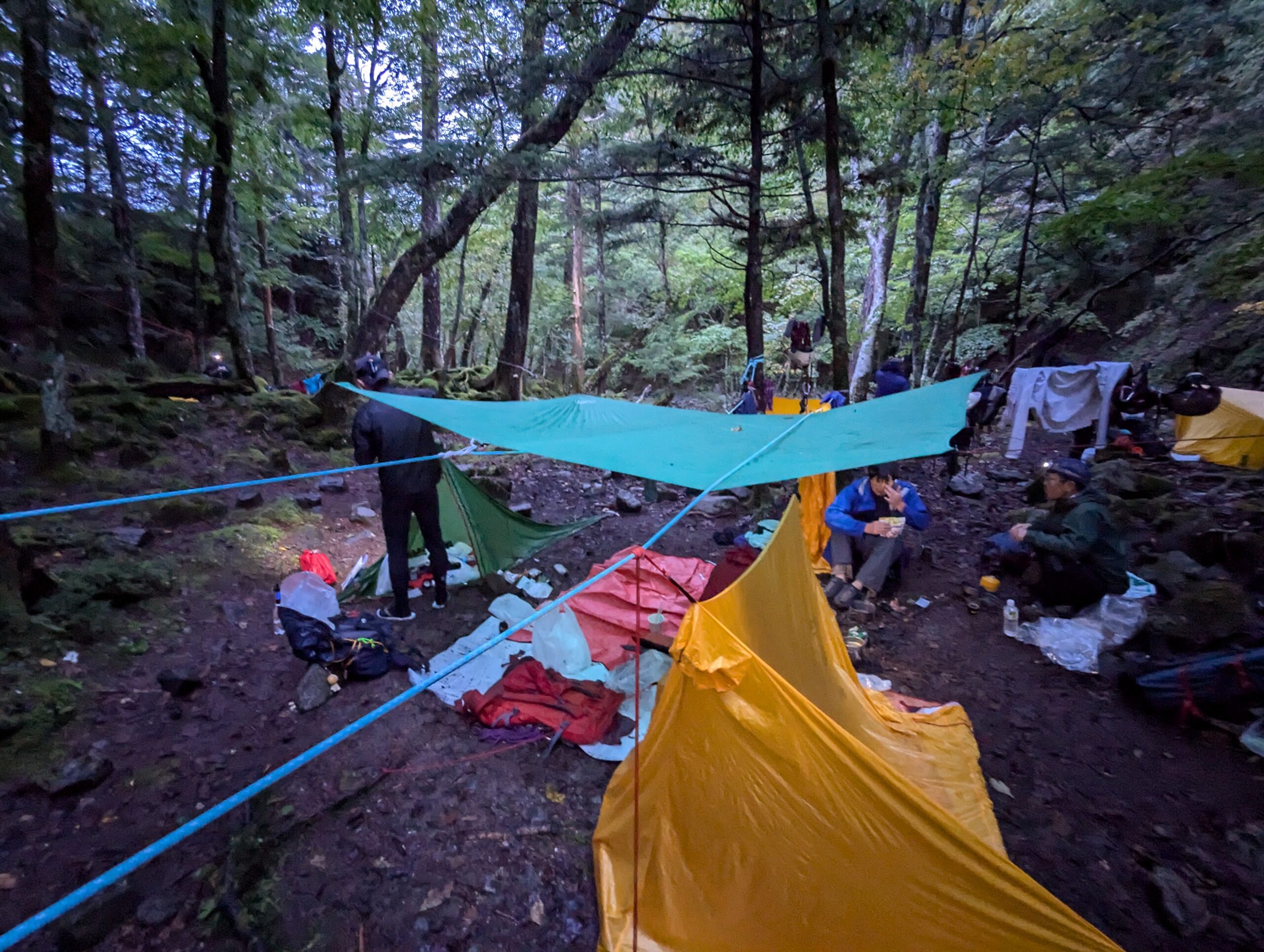 今回は、ツェルト泊。雨の中、急いで張っていると、次第に弱雨に。張り終わった頃には、完全に止みました、、、、、。まぁ…よくあることですね。